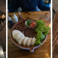served ssam style, caramelized mushrooms, scallion pancakes, sushi rice chinese black garlic sauce
